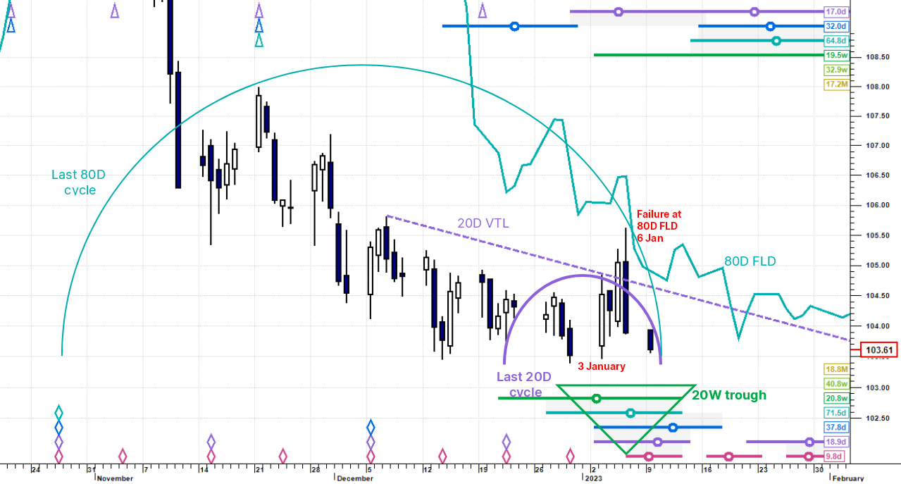 The sudden move up that began last Tuesday (3 January) was abruptly stopped at the 80 day FLD – as we suggested would happen in last Friday's update – and has since pulled back sharply. Drilling down into intraday charts (not shown here) the move up across the range from 103.39 (30 December low) to 105.63 (6 January high) is a clear countertrend zig-zag move, which strongly suggests that the big low has not actually happened yet.