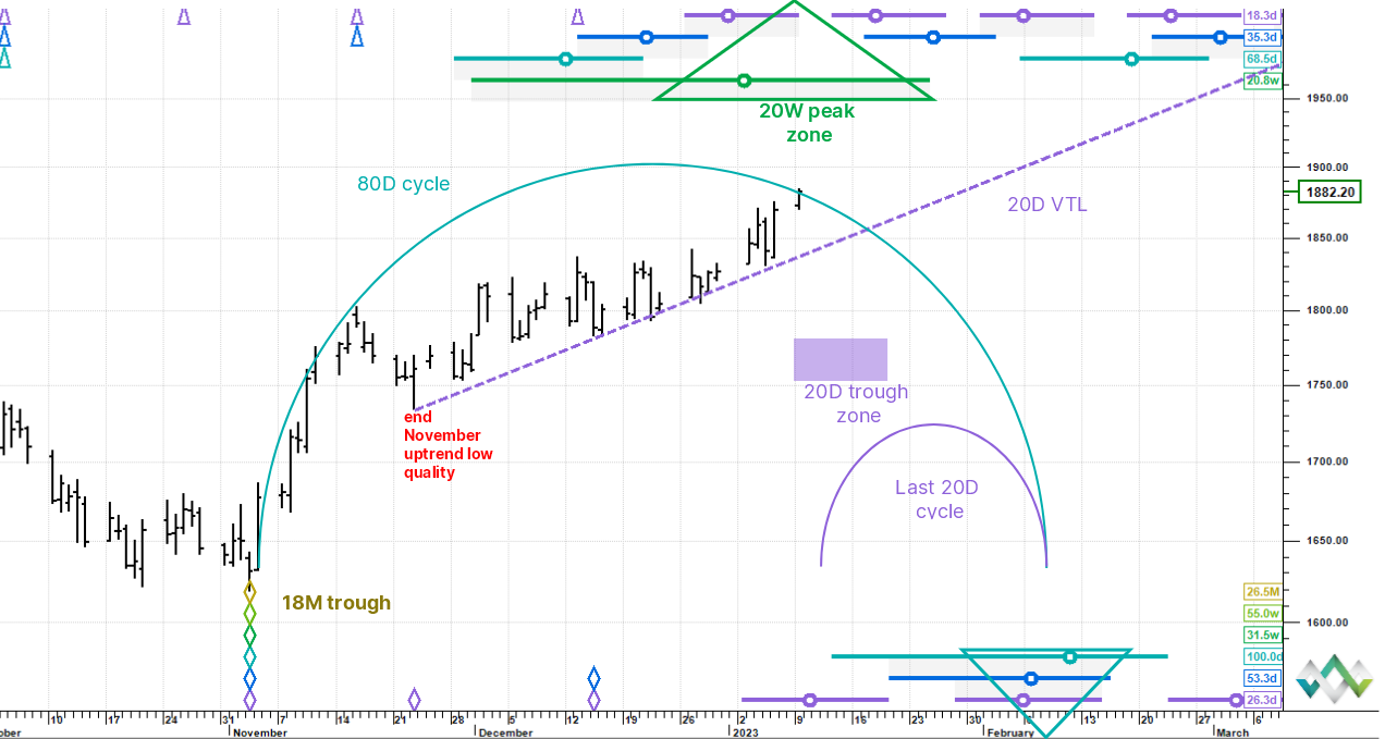 The first trigger to confirm a bearish reversal would be a penetration down through the purple 20 day VTL (the upsloping valid trendline associated with the 20 day cycle). If that occurs around 1,850-ish (we cannot know precisely yet), then we know with certainty that the 40 day cycle has peaked and by association – in this case – also the 80 day and 20 week cycles. The stack of circles marking the peak zone shows this at the top of the chart.
