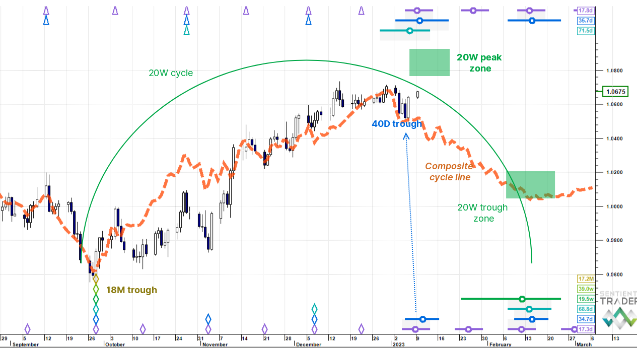Euro Dollar: exploring a 20 week cycle peak zone imminently and then a firm downside resolution