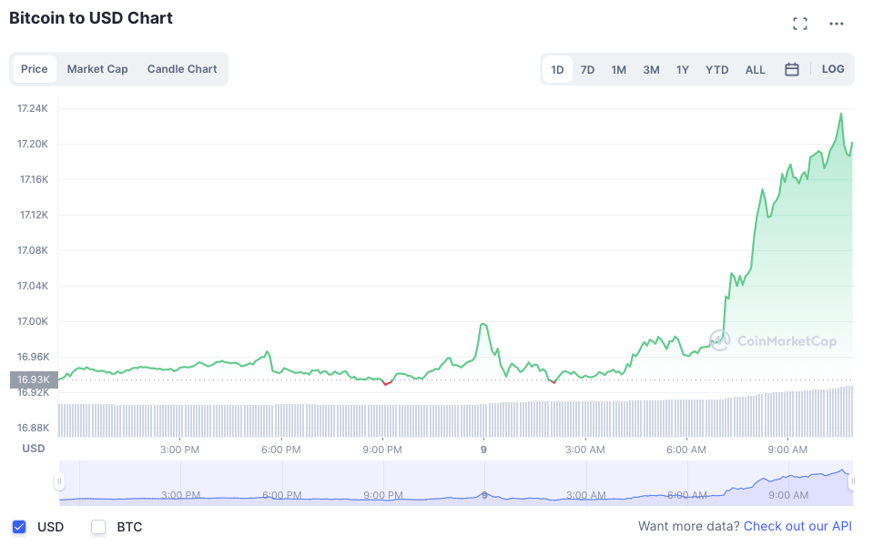 At the time of writing, Bitcoin (BTC) is trading at US$17,220.64 (+1.64%) while Ethereum (ETH) is trading at US$1,310.82 (+3.80%). Major altcoins such as BNB, Polkadot (DOT), and Avalanche (AVAX) have also been trading in green within the same period.