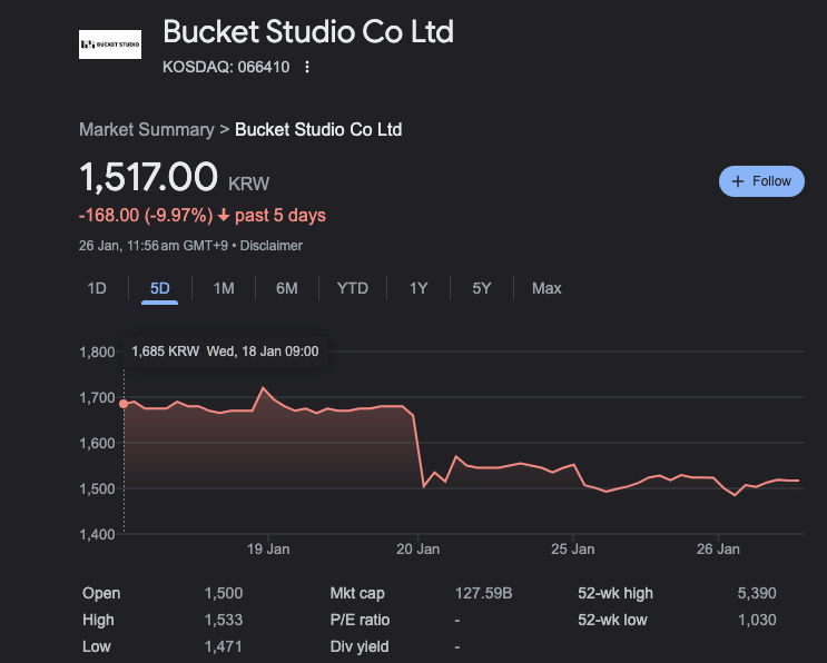 Bucket Studio is tied to Netflix hit Squid Game for owning 15% of lead actor Lee Jung-jae's agent Artist Company. Its stock price jumped 30% upon the announcement of season 2.