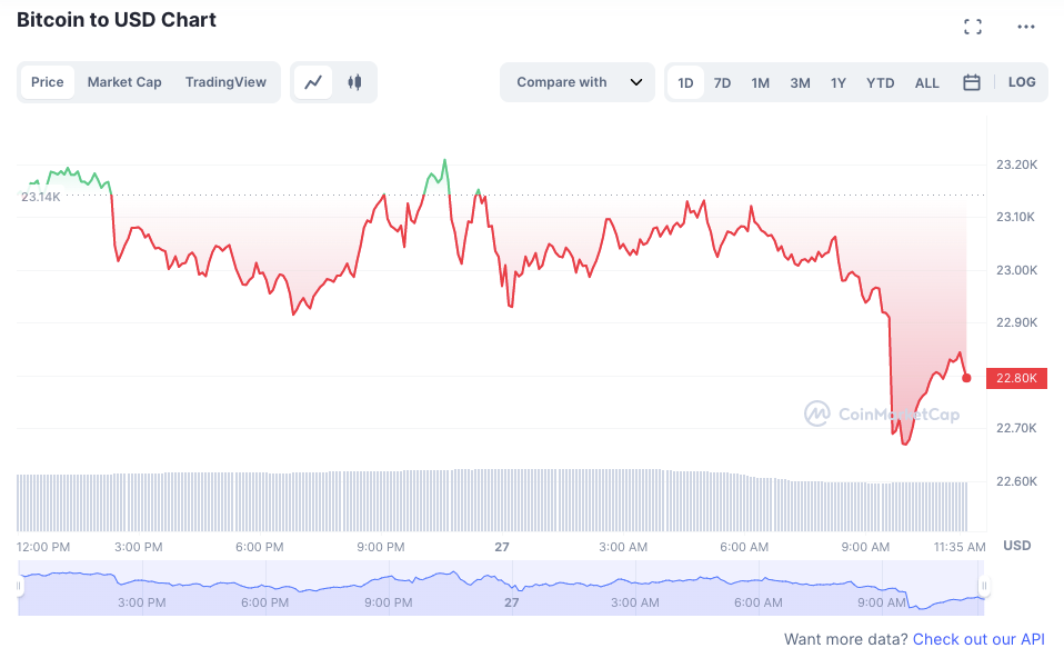 At the time of writing, Bitcoin (BTC) is trading at US$22,823.73 (-1.62%) while Ethereum (ETH) is trading at US$1,571.38 (-2.68%). Major altcoins such as BNB, Avalanche (AVAX), and Polkadot (DOT) have also been trading in red within the same period.