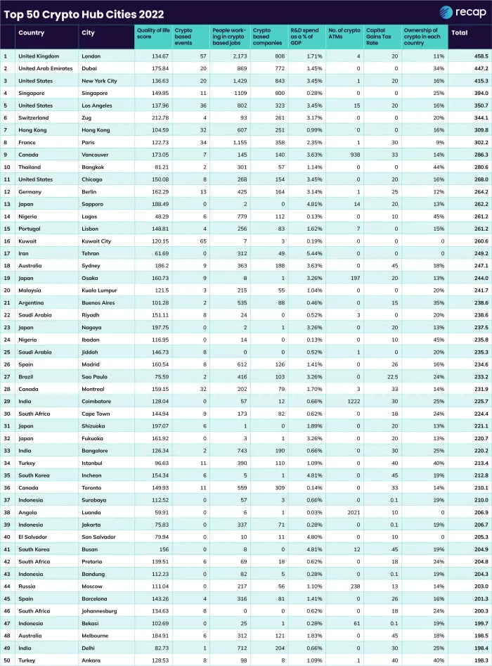 In its latest research paper titled "The Rise of Crypto Hubs: Which Cities are Leading the way in Cryptocurrency Adoption?" the firm listed the top 50 crypto hub cities.