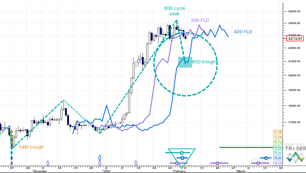 The analysis has shifted the outer range of the next 80 day cycle trough to later this week. The 20 day FLD price cross down projects to below 21,800 where the 40 day FLD is met. This implies a very sharp sell off to catch up.