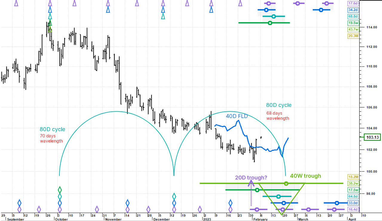 We think that the very last 20 day cycle in the current 80 day cycle bottomed last Thursday. It probably caused last Friday's price spike through the 40 day FLD which projects to 103.6.