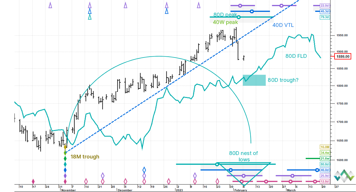The 80 day FLD is a potential support level around 1,840, so pay close attention here. Also, because the most recent peak was high magnitude, its not unreasonable to expect a stronger push down. The early November 2022 trough was a big cycle (18 month cycle) and the current 80 day cycle peaked late (right translated), therefore the underlying trend is bullish and we think that the 80 day FLD holds price.
