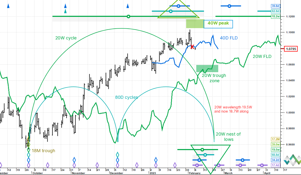 The awaited 40 week cycle peak looks to be in and price has just crossed down through the blue 40 day FLD. This generates a downside projection of 1.065, which because of the recent high magnitude peak is likely to overshoot to the downside. A 20 week cycle trough is due between 14 and 24 February and in this set up the green 20 week FLD running across the chart could offer support around 1.05. This is where we are focusing for now.
