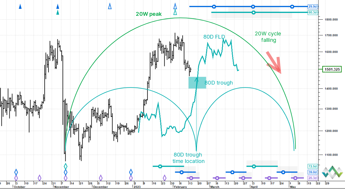 The 2 February high was the peak of both the 20 week and 80 day cycles. The next 80 day cycle trough is due this week and a likely stopping place is the blue line, the 80 day FLD circa $1400. At which point the expectation is for a new 80 day cycle to commence.