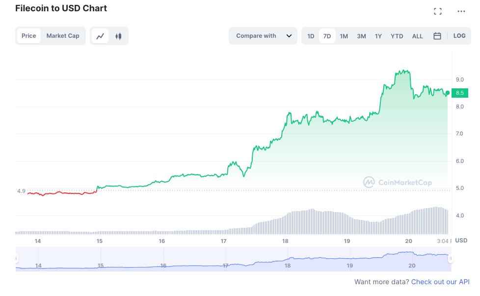 Reaching highs of $9.34, FIL has surged over 80% from its price of $4.80 last week, outperforming the likes of Bitcoin.