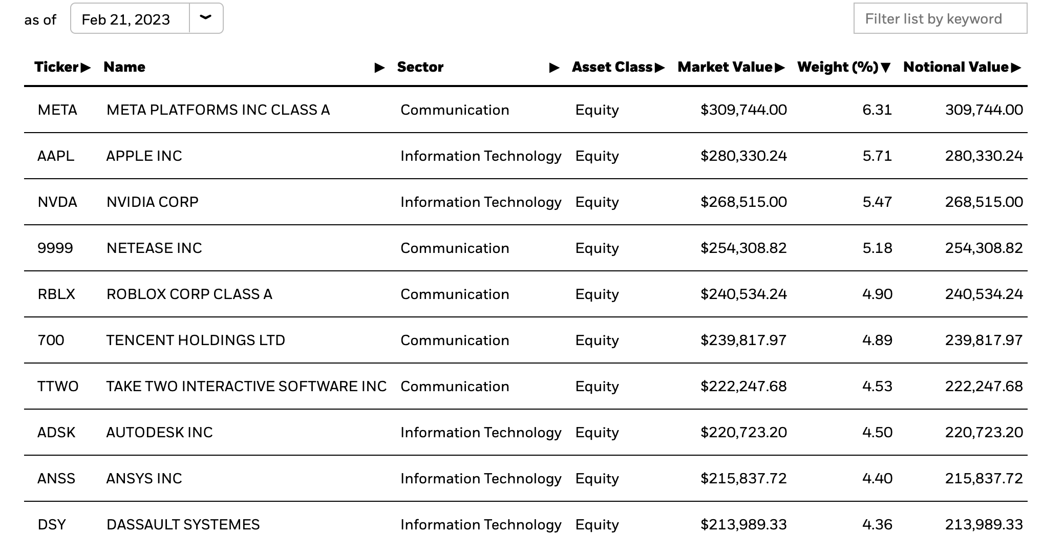 Its top five companies by percentage share are Meta, Apple, Nvidia, Netease and Roblox.
