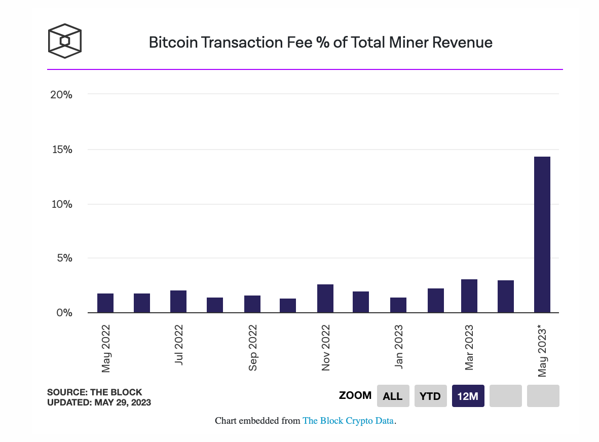 - Bitcoin transaction fee revenue soared this month due to Ordinals, according to data from The Block. Transaction fees hit their highest level in over two years, reaching 14.3% as of 29 May, surging over 11% compared to April. Following the growth of Ordinals, Bitcoin has become the second-most active network for NFTs after Ethereum. Transaction traffic also hit a new monthly high in May, reaching 14.9 million as of yesterday. Overall monthly mining revenue is also at its highest level since last year, heading towards $840 million.