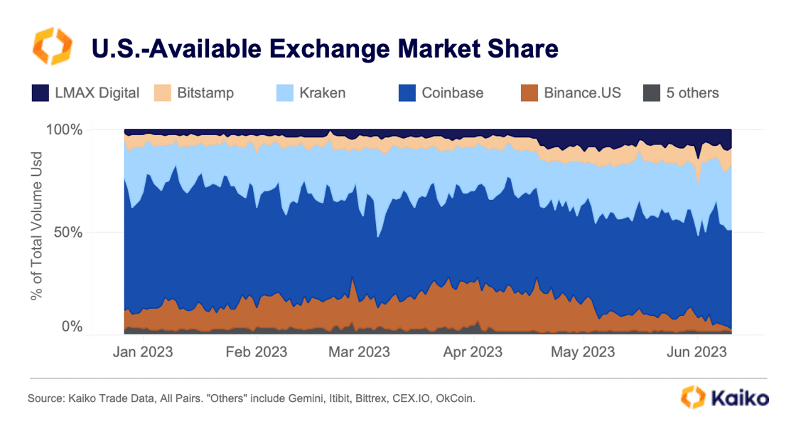 According to a research note published yesterday by Kaiko, Binance.US has seen its market share in trading volume drop to 1%, down from its all-time high of 27% just a few months ago.
