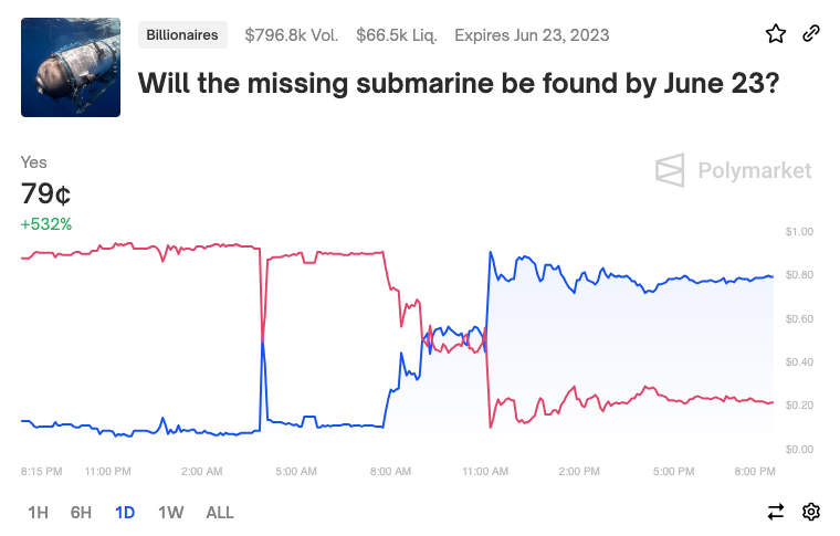 Meanwhile, degens have been betting on whether the missing OceanGate Titan submarine would be found. As we now know, the five on board have been confirmed dead following a "catastrophic implosion" of the submarine.