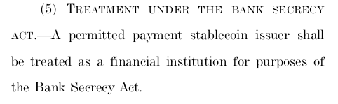 Therefore you'd expect the rules imposed on stablecoin issuers by the Fed to look a lot like the rules imposed on banks. And in fact the bill makes clear that the "Bank Secrecy Act" will apply as usual here: