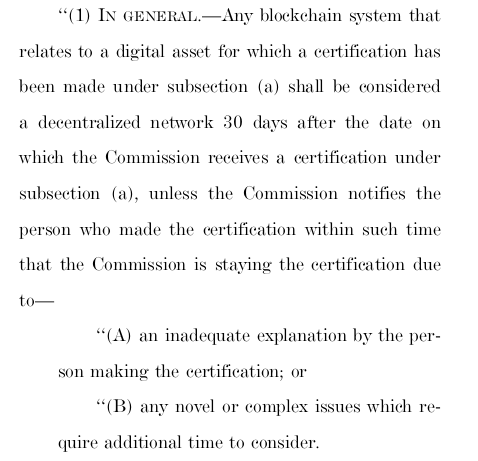 And even stranger the market structure bill puts the onus on the SEC to work out within 30 days if a candidate decentralized product is in fact so. This passage is strange: