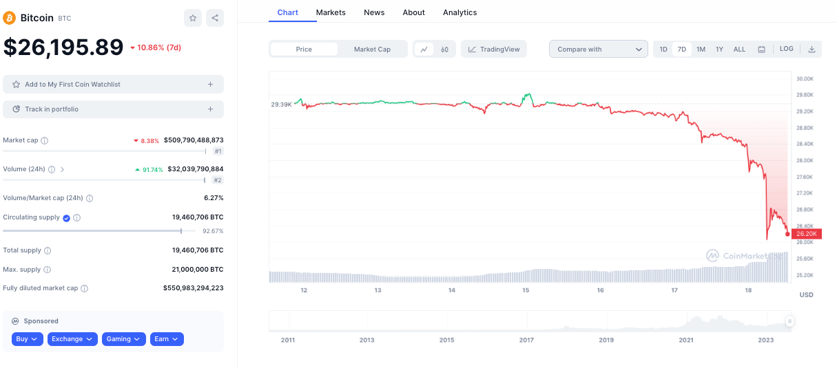 Crypto volatility is nothing new but it's been yet another wild day in the market. Bitcoin dropped 8% within 10 minutes to reach sub-$26,000 (not seen since June), XRP fell 15%, and Ethereum declined 9% before jumping 11%. According to Coinglass, $1 billion in cryptocurrencies, with long positions accounting for $812.67 million, has been liquidated over the past 12 hours.
