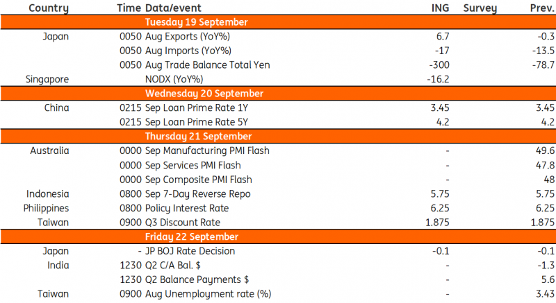 Central banks in Indonesia, Japan, the Philippines, and Taiwan will hold their respective policy meetings this week. China will also be announcing its 1-year and 5-year LPR rates.