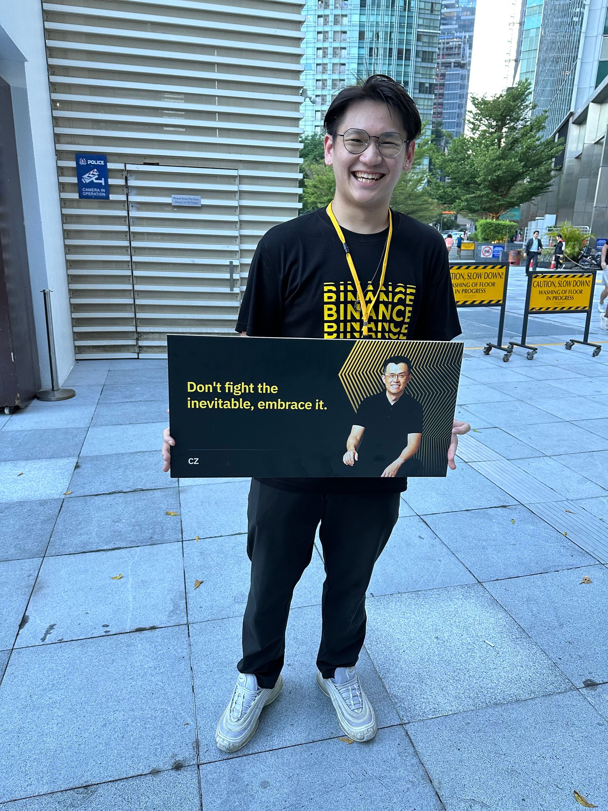 Binance's presence was pretty limited at TOKEN2049's side events. Our team caught wind of just one Binance event, which wasn't even listed on the official TOKEN2049 side events document. We only chanced upon the event whilst attending another event, spotting a Binance lackey holding a sign reading, "Don't fight the inevitable, embrace it" next to a gaumless-looking Zhao.