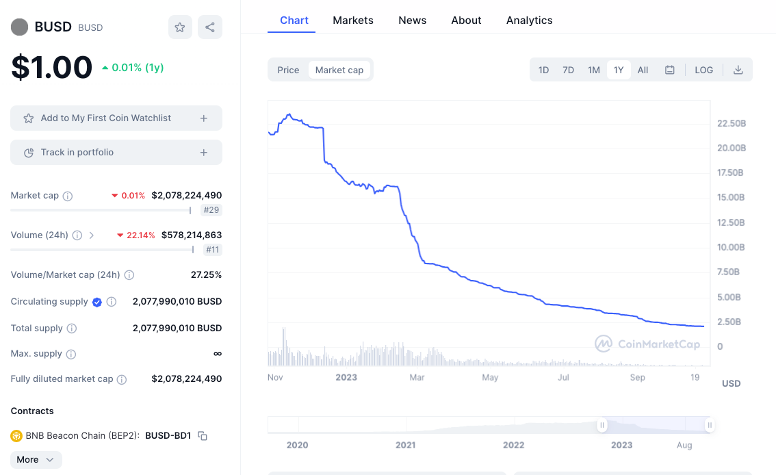 Binance is even withdrawing from its own stablecoin, BUSD. Now down 90% from its all-time high, its market capitalization has shrivelled from $23.49 billion in November 2022 to $2 billion.
