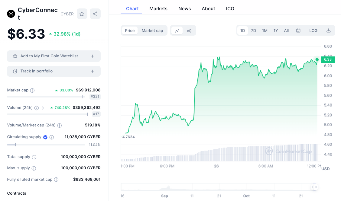 Meanwhile, decentralized social network CyberConnect saw a 30%+ surge in its token value following an investment announcement by Binance Labs.