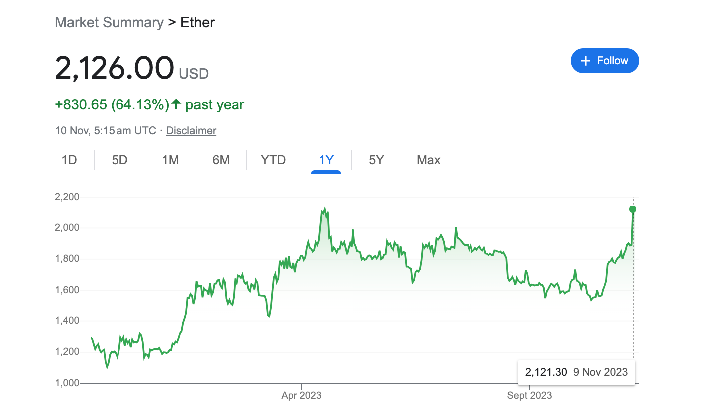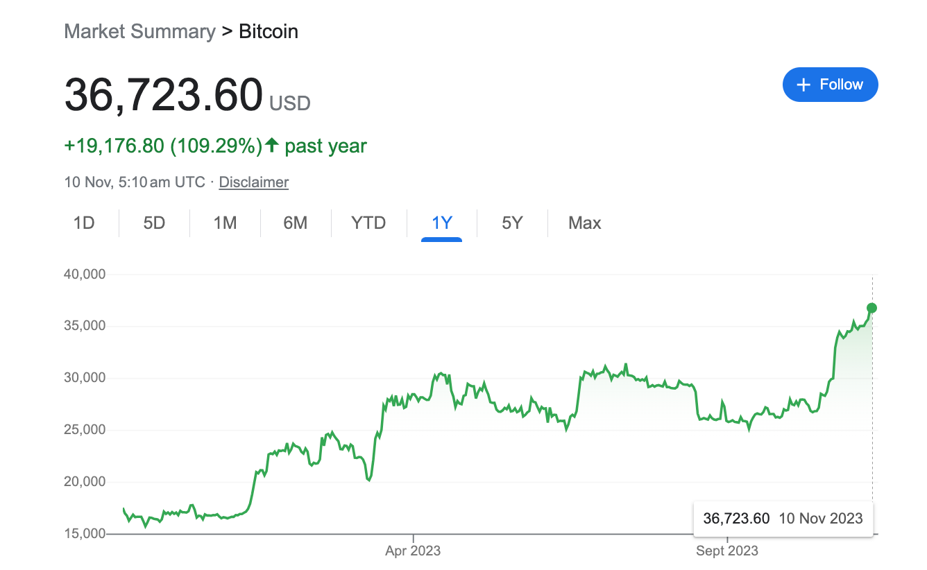 As excitement surrounding the impending approval of Bitcoin ETFs increases, so does the price of Bitcoin. Sitting at yearly highs of $36K to $37K, Bitcoin is up more than 100% over the past year. It's a similar story for Ethereum too, which is up over 60% from last year.
