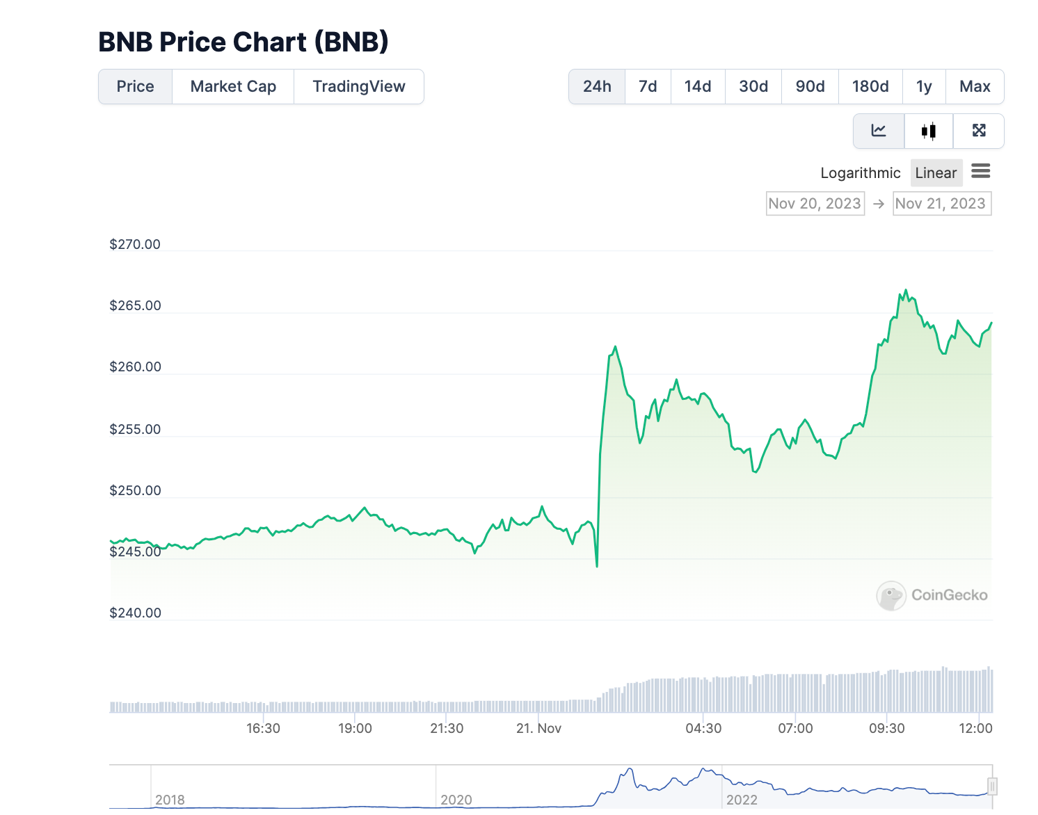 A quick glance at Binance's own token, BNB, will affirm this. Since the news broke, BNB jumped as high as 8%. Even Bitcoin rose another 2%.