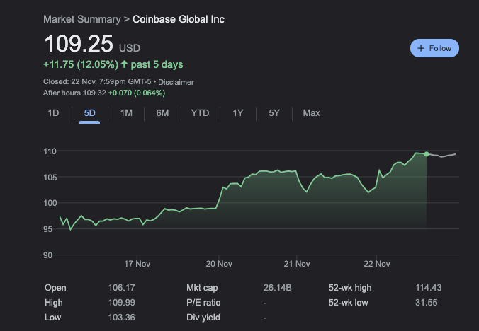 Coinbase has experienced a continuous rise in its stock price too, rising 12% over the past few days and more than 41% throughout the past month.