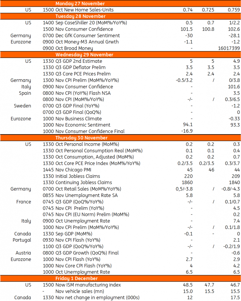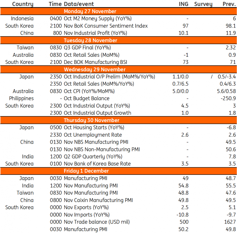 Markets are bracing for the Bank of Korea to implement another hawkish pause at next week's meeting due to ongoing concerns over inflation's recent acceleration. The release of Chinese PMIs, Australian inflation statistics, Indian GDP numbers for the third quarter, and maybe even more encouraging news from Japan are all on the horizon.