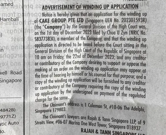 "The Winding Up Application has NOT been brought on the grounds that Cake Group Pte Ltd is unable to pay its debts," Hosp said. "In this respect, our day-to-day operations remain unaffected and we continue to operate at full capacity to deliver our products and services."
