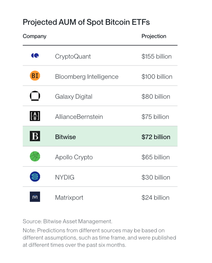 First, Bitwise envisions Bitcoin surpassing $80,000, on the back more higher demand due to the introduction of spot Bitcoin ETFs (this isn't a sure thing though), as well as the supply of Bitcoin being cut in half following the next bitcoin halving scheduled for April-May 2024. For context, that's like your favorite underground band suddenly topping the charts. You're not surprised, but you're texting your friends, "Called it!"