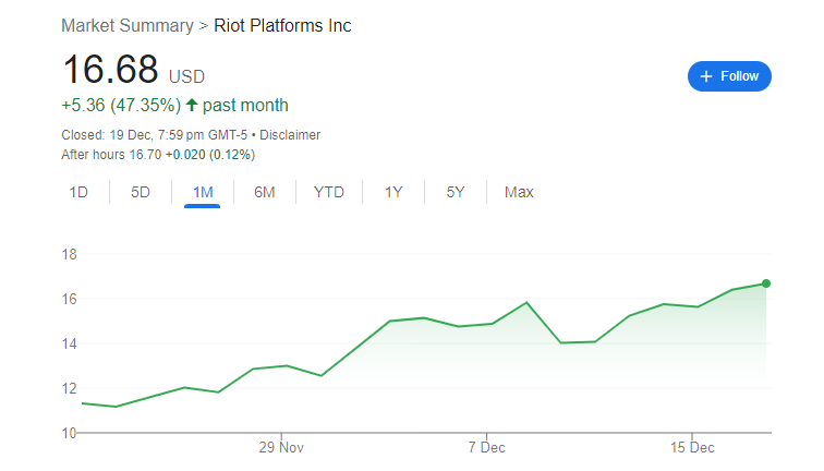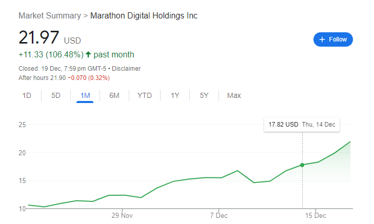 Riot Platforms (NASDAQ: RIOT) is up 47% over the month whilst Marathon Digital Holdings (NASDAQ: MARA) has jumped more than 106% in the same period.
