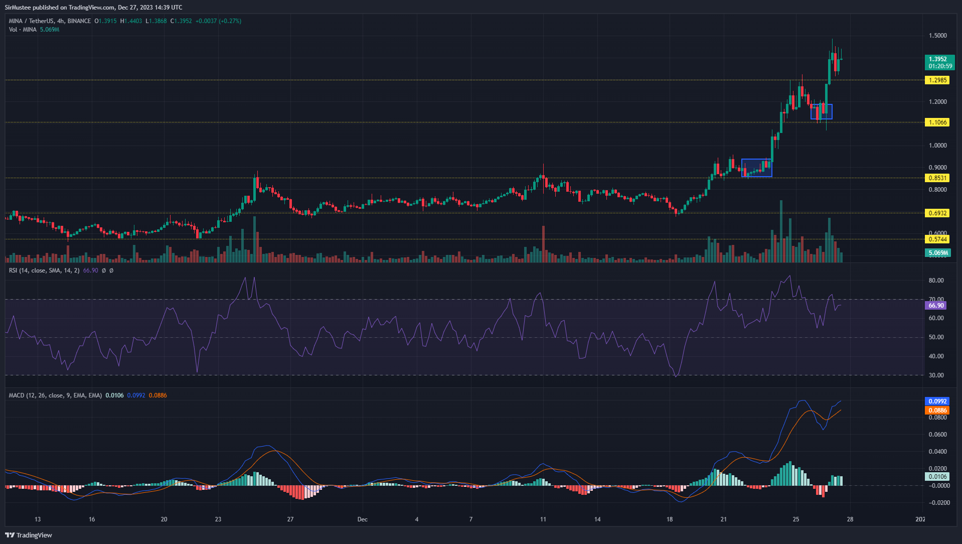 MINA produced a 10% rebound off the $1.29 support level to sustain its upward price trajectory. Earlier, the altcoin had suffered a dip after hitting the $1.5 price level. However, buyers rallied significantly to reverse the price dip and extend the bullish momentum.