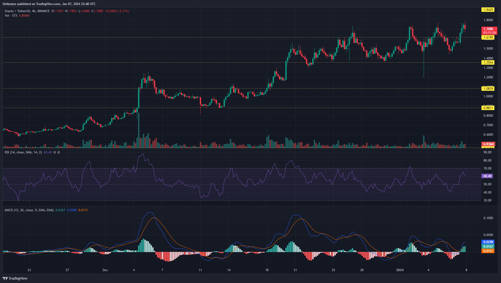 As of the time of writing, $STX was trading at $1.70 on the four-hour timeframe. Following the break of the resistance level, STX could reach $2 in the near term.
