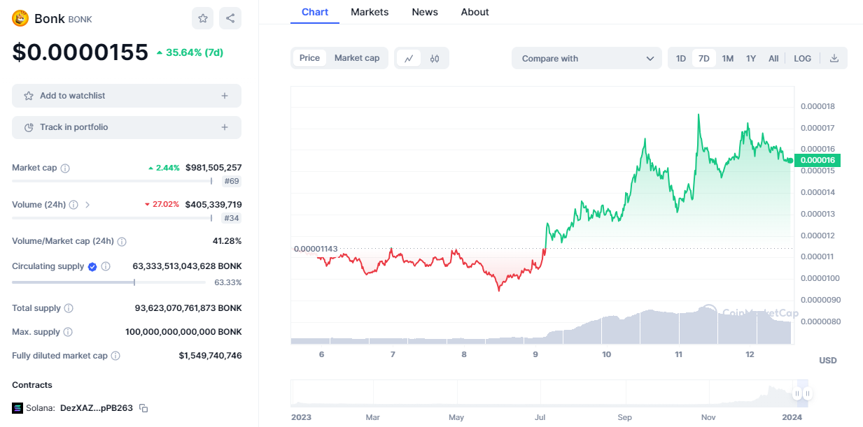 Well, after a short dip at the start of January, BONK has returned to bonkers-mode. Over the past week, BONK has jumped more than 35%.