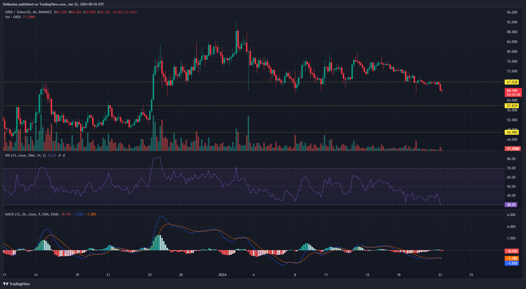 The recent dip saw ORDI sellers flip the $67.5 support to resistance with a 10% dump. With a full bearish candle close under the new resistance level after some sideways price action, intraday traders can take advantage of a new shorting opportunity.
