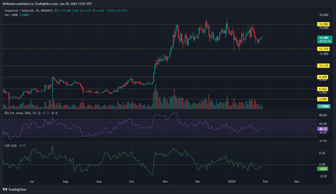 Analyzing LINK’s price action on the daily timeframe showed that the altcoin closed bullish over the past three days. The last time this price action was seen on the daily timeframe was in November 2023 and LINK went on a 61% run from $10.1 to $16.5.