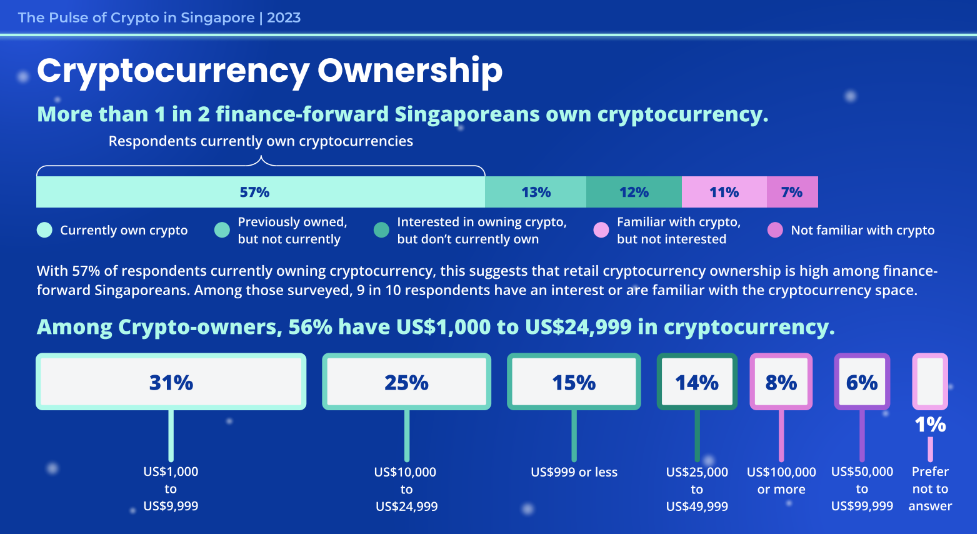 57% of those surveyed said they own cryptocurrency with 56% of crypto owners saying they have US$1,000 to $24,999 in cryptocurrency.