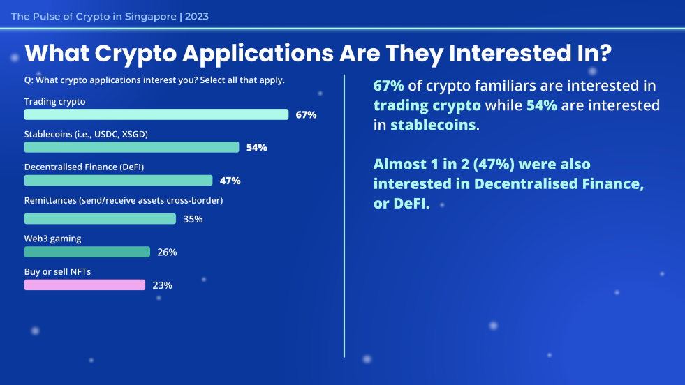 67% of Singaporean crypto enthusiasts are interested in trading the digital asset whilst 54% expressed an interest in stablecoins. And 47% are down the DeFi rabbit hole.