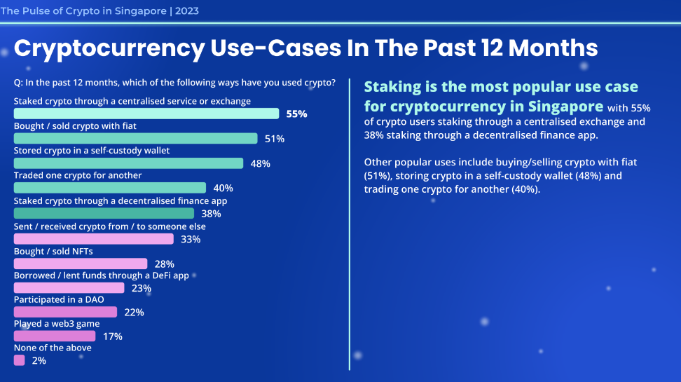 Staking is proving to be the most popular use for cryptocurrency in Singapore. About 55% staked crypto through a centralised exchange whilst 38% chose a decentralised finance app.