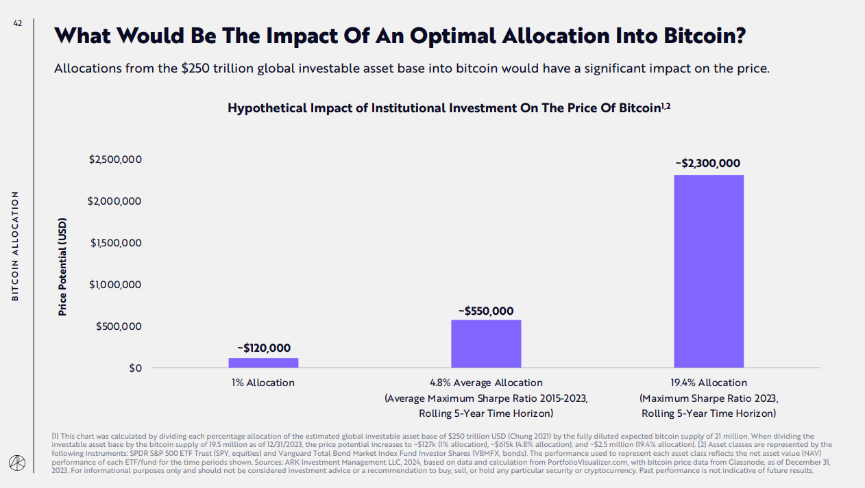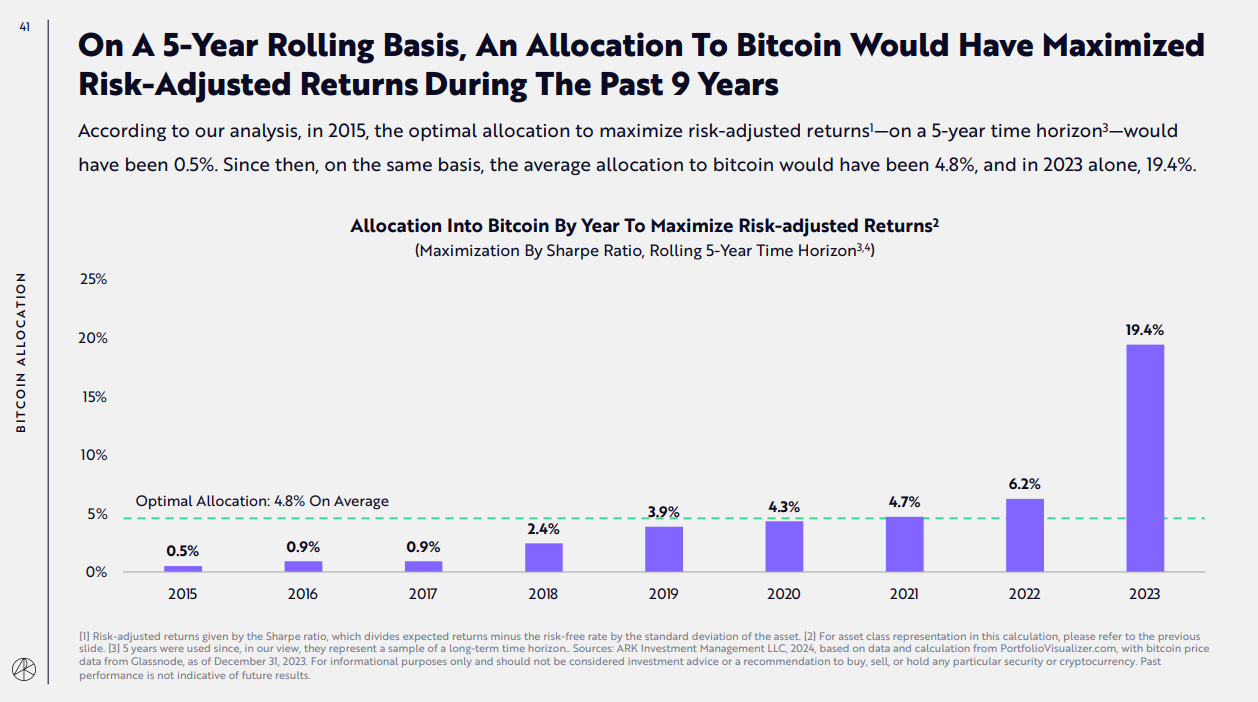 ARK encourages institutions to allocate a certain percentage of their portfolios to Bitcoin to maximize risk-adjusted returns. Providing simulated optimal portfolio allocation targets, ARK suggests that a portfolio seeking to maximize risk-adjusted returns would have allocated 19.4% to Bitcoin in 2023.