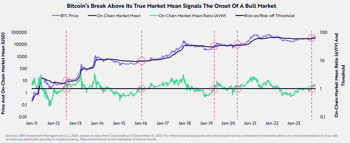 "Historically, when the price of bitcoin crosses above the market mean, it typically indicates the early stages of a bull market," Ark explains.