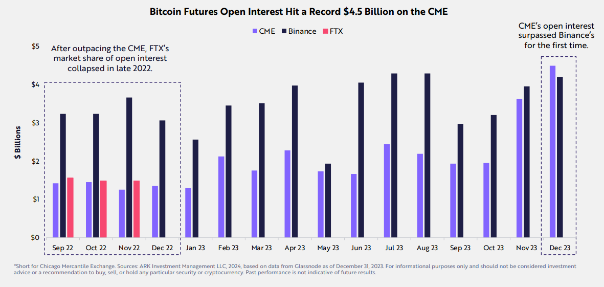 However, another interesting development that was rather overlooked occurred in December 2023 when Chicago Mercantile Exchange (CME) surpassed Binance as the world's largest Bitcoin futures exchange. Although Binance was undergoing its own reshuffling, the CME's strength reflects the broader interest from TradFi in crypto.