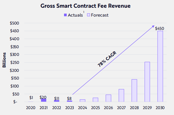 What's more, if financial assets transition to blockchain infrastructure, and decentralized financial services charge one-third of the fees of traditional services, smart contracts could generate over $450 billion in annual fees. This could create more than $5 trillion in market value. ARK believes these figures are projected to grow at compound annual rates of 78% for fees and 32% for market value through 2030.