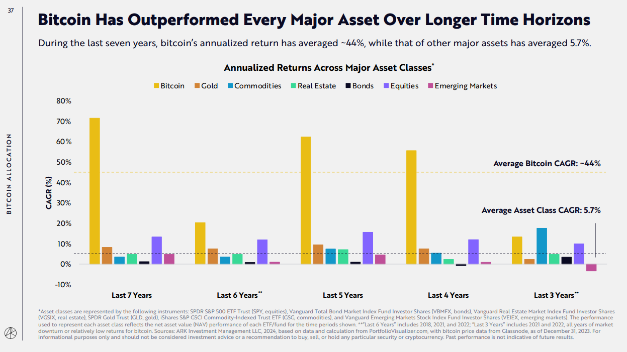ARK Invest highlights how Bitcoin outperformed every major asset over three to seven years. Offering around a 44% return, Bitcoin has produced 7x the returns of major assets' 5.7%.