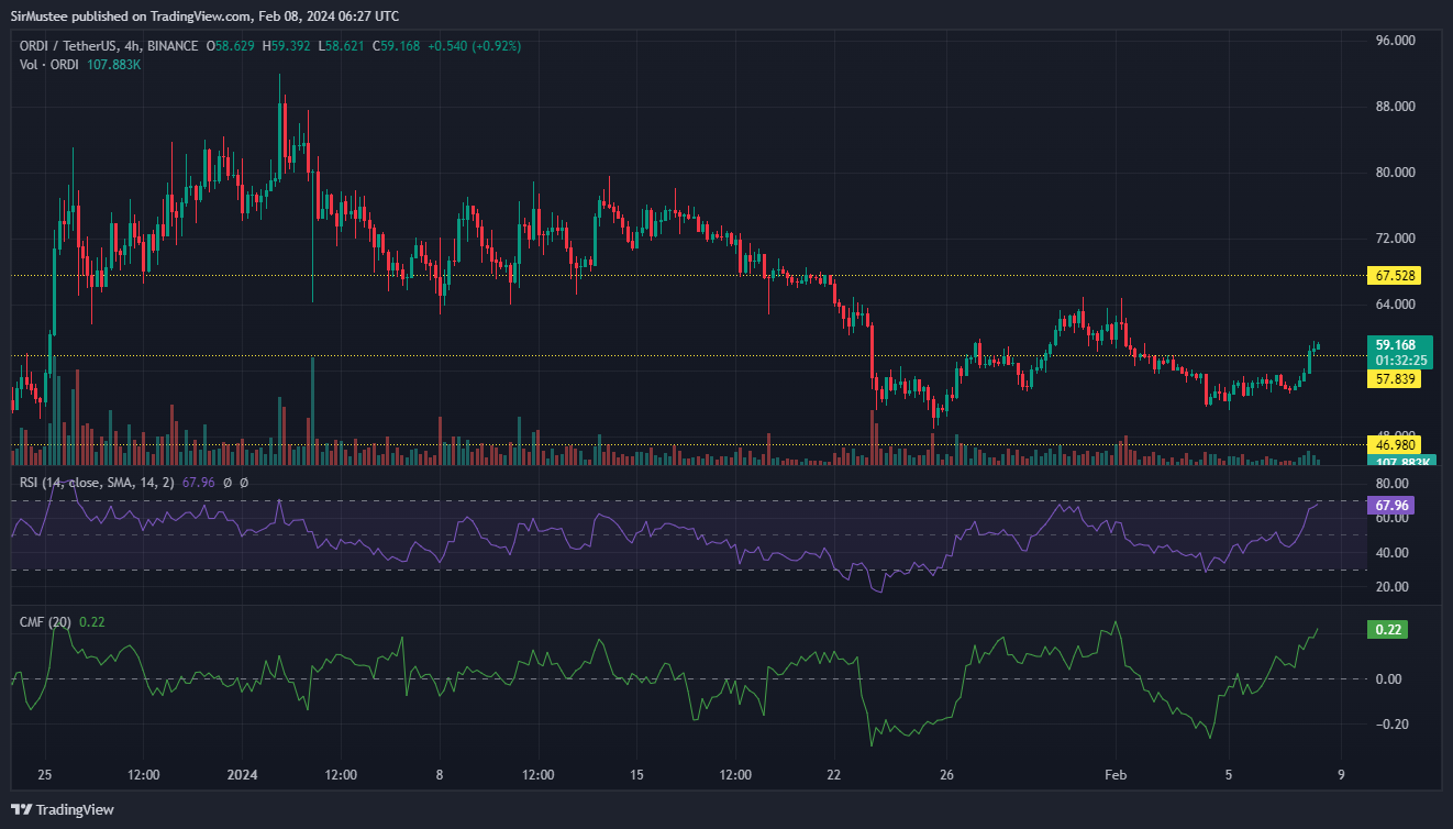 Over the past 24 hours, a 9% pump has seen ORDI recover the $57.8 support level. The recovery of this support level is key for buyers, as this support level produced a massive 62% pump in December.