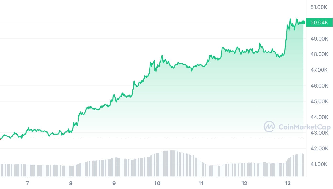 Following a 64% decline in 2022, the value of the token has tripled since the beginning of last year. The previous time Bitcoin was worth $50,000 was in December 2021.