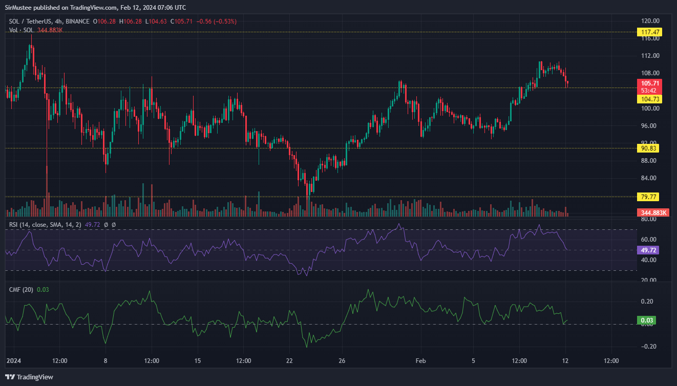 Solana’s bullish run from the $90 price zone experienced a slight dip after hitting the $110 price mark. This came after SOL formed a double bottom on the four-hour timeframe at the start of February before going on a bullish run.