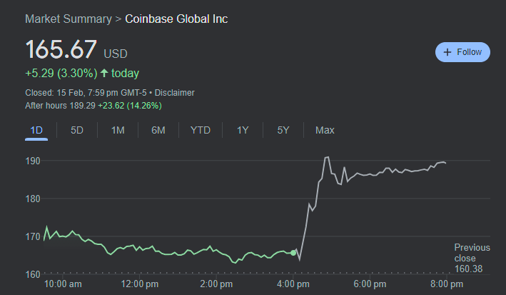 Revenue of $953.8 million exceeded analysts' forecast of $826.1 million, sending the crypto exchange's stock price up nearly 13% after the bell, marking a 150% increase in the last 12 months.