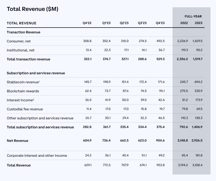 Coinbase expects to generate $410 million to $480 million in subscription and service revenue in the first quarter of 2024.