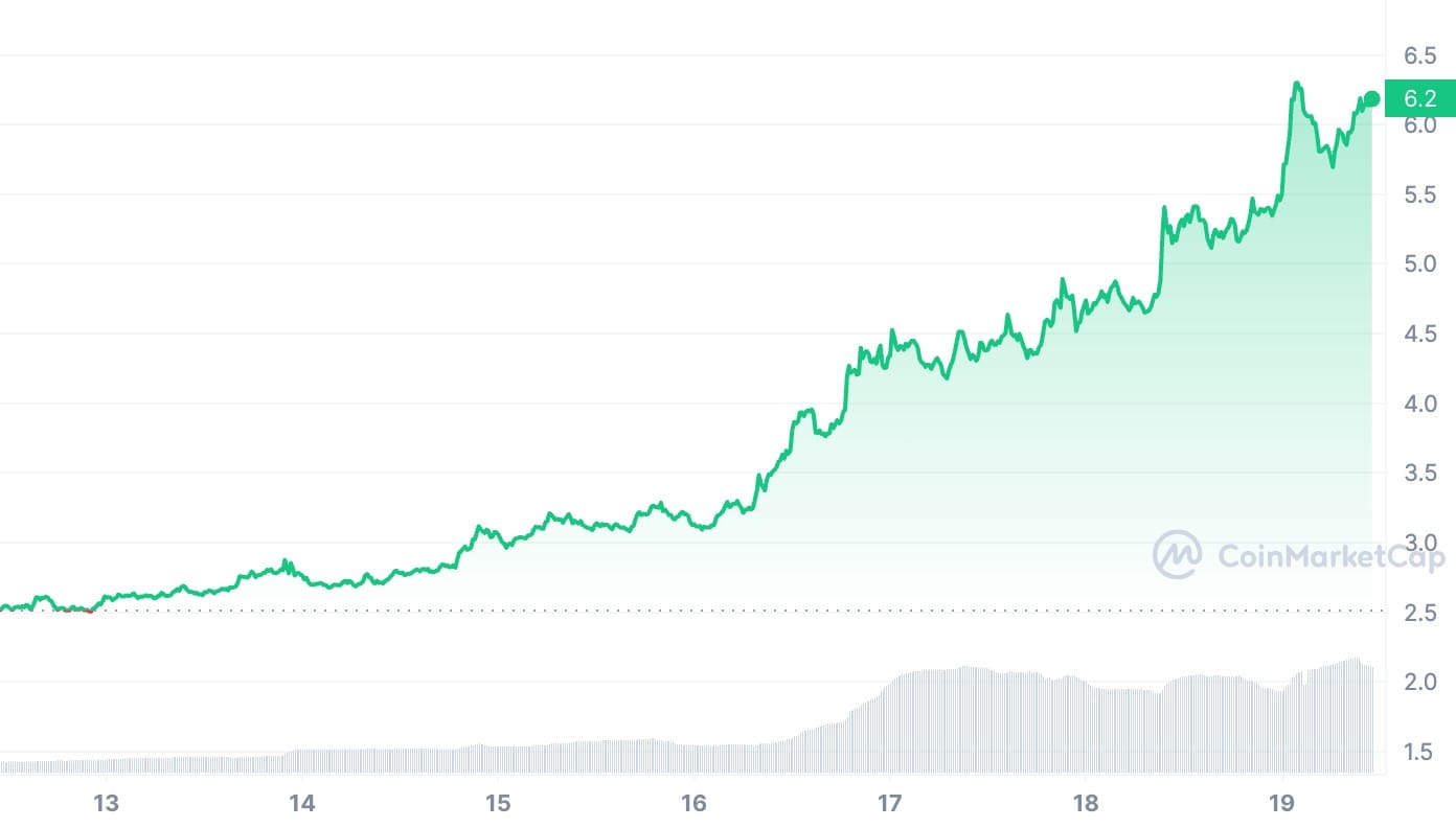 Worldcoin (WLD) has emerged as the latest spectacle in the crypto… sphere, riding a wave of staggering growth that has left spectators both dazzled and dizzied. With its price soaring to a lofty $6.32, marking a jaw-dropping 149% increase in just the last week, it seems the crypto community has found its newest darling—or dare we say, its latest gamble